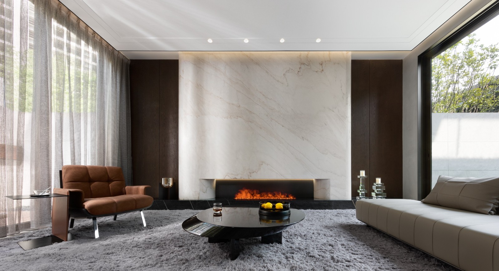 归家动线自负一层车库延伸开来,无缝连接会客空间,高耸浓郁的深棕木纹,调和洁白雅致的大理石立面,自带中性气息的硬朗皮革坐椅和沙发,将空间气息勾勒得犹如意式浓缩一般,浓厚香醇且回味无穷。