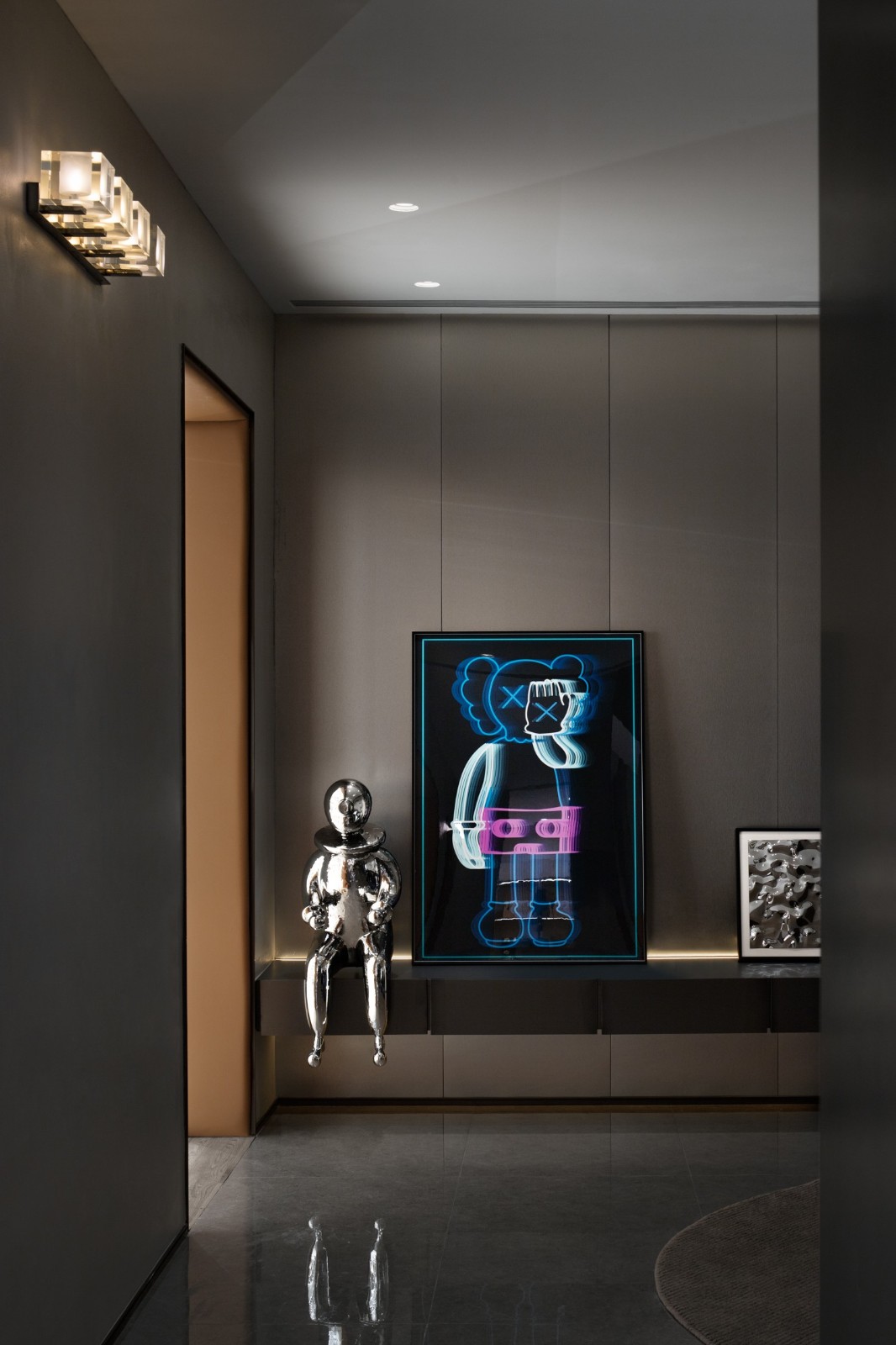 墙面挂画上闪烁着极富未来科技感的光泽,与KAWS艺术玩偶的潮玩元素交织融为一体,为VR影音电竞室注入超现实感;戴上VR头盔,沉浸于3D虚拟世界,如身临其境地体验运动、娱乐、观影带来的趣味,为空间呈现出个性独特的光芒。