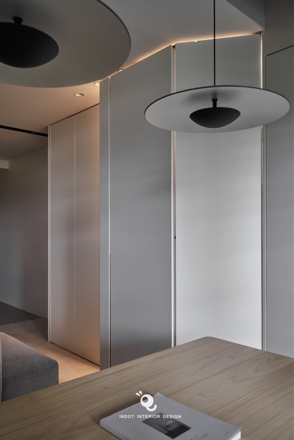 - 餐厅往客厅视角,右侧为一整面储藏室及收纳空间,电视墙左侧是客房,後方为客浴,下方内凹悬空让光线引入狭长的玄关。