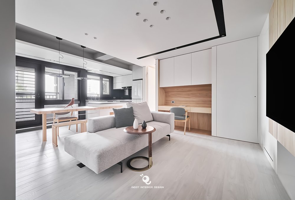 - 因为坪数小,所以客厅餐厅的配置就格外重要,我们翻转了客厅及餐厨空间位置,让动线形成一个回字型,这样的优点就是会形成一种空间深度,这时候把收纳集中在四周,开阔感也会更好。这个空间楼高不高,这时天花反而越简单越好,但我刻意在客厅与餐厅中间藉由脱开的天花缝隙,界定这不同的空间使用,也增加空间层次感。