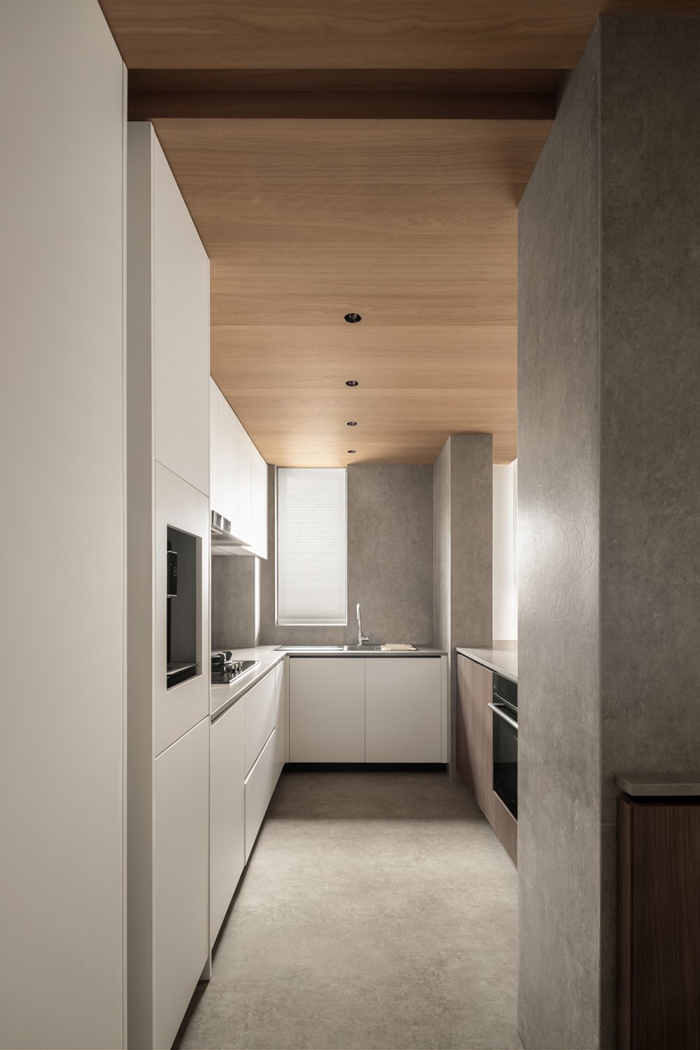 开放式厨房不同于以往顶面采用木作吊顶表面使用了KD木饰面墙地的瓷砖与客厅地砖相同空间整体性更强内嵌式冰箱藏入柜体U型厨房动线 操作舒适