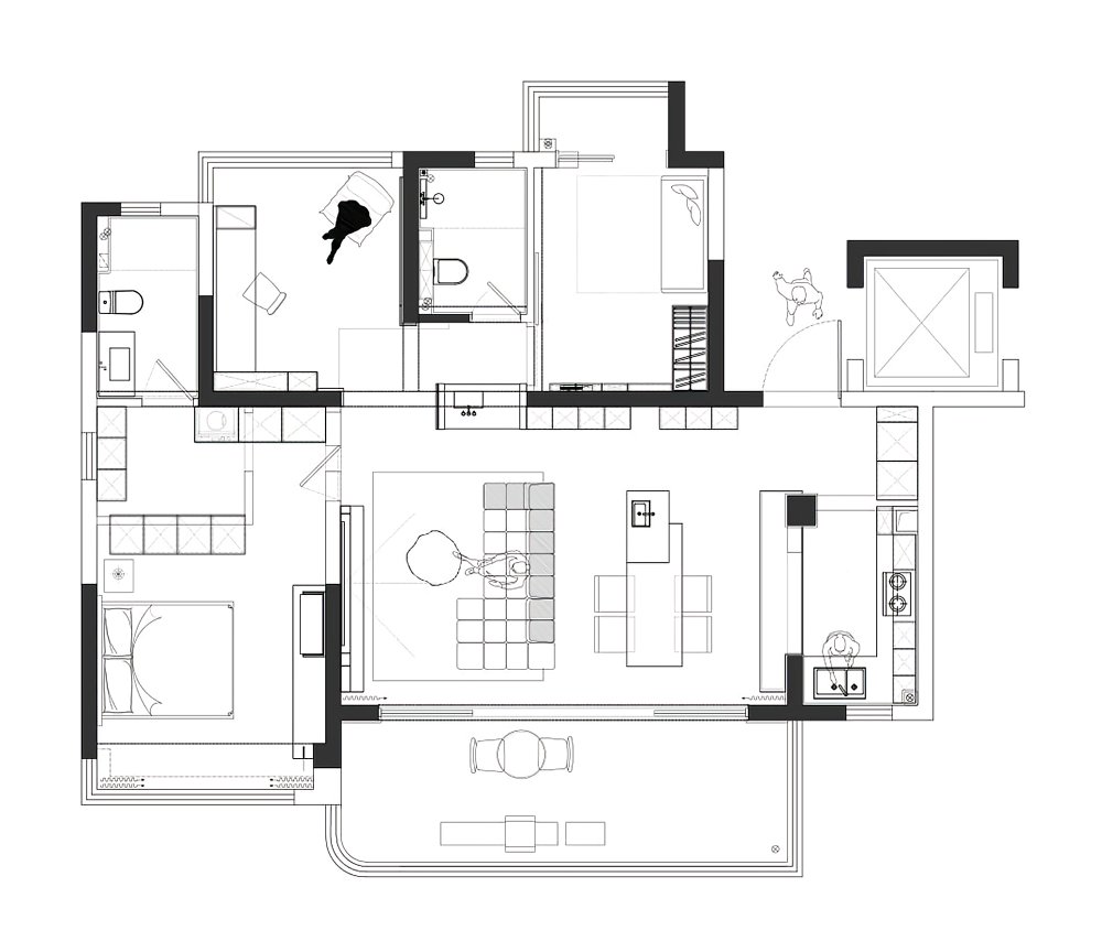 一整面的落地百叶帘随温暖如春的风柔柔摆动组合式沙发回字型动线不论是会友、聚餐都可以随时互动