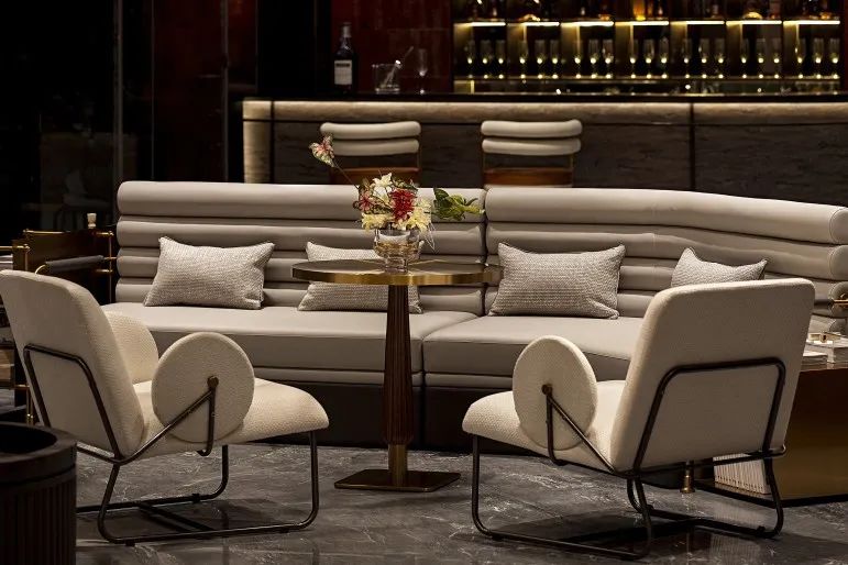 中心艺术装置衍生出洽谈、音乐、文创周边售卖等多重功能单元,家具以围合式布置,促发了交流的发生,包裹式的靠背椅,营造更为放松的休闲洽谈氛围。