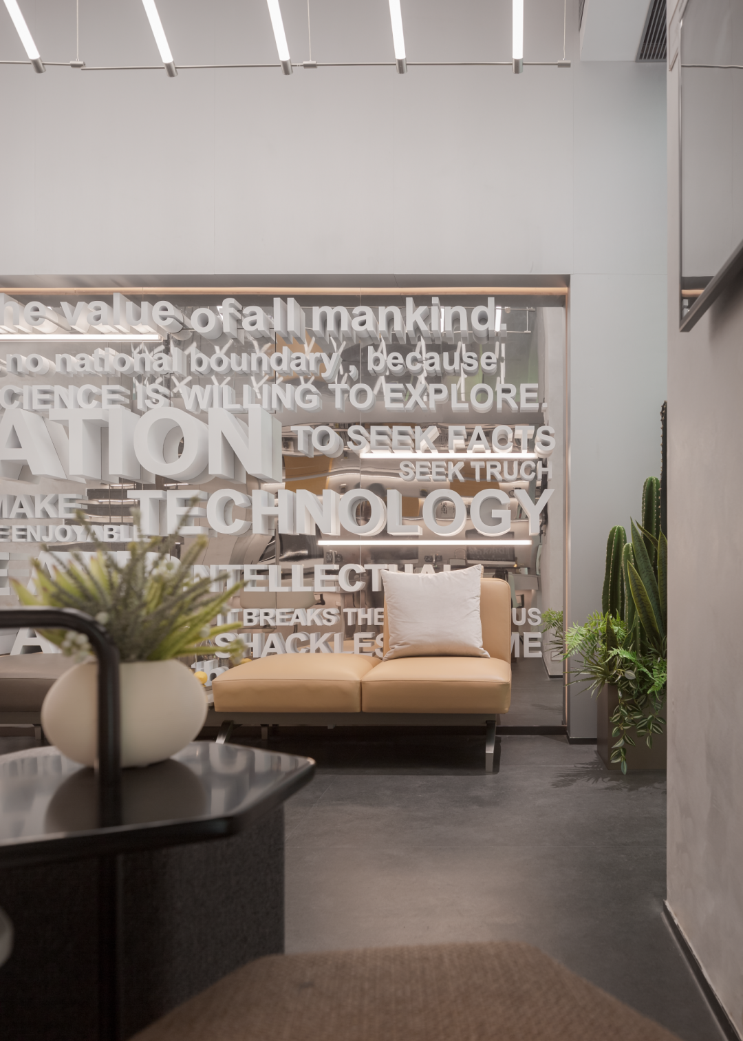 打破传统的空间界限,开放办公区方便互相交流,鲜活的社交气息,使空间氛围变得亲近而有趣。尽头处意大利艺术家Biasi的作品《门》以虚拟运动学的概念呼应Robot的主题。