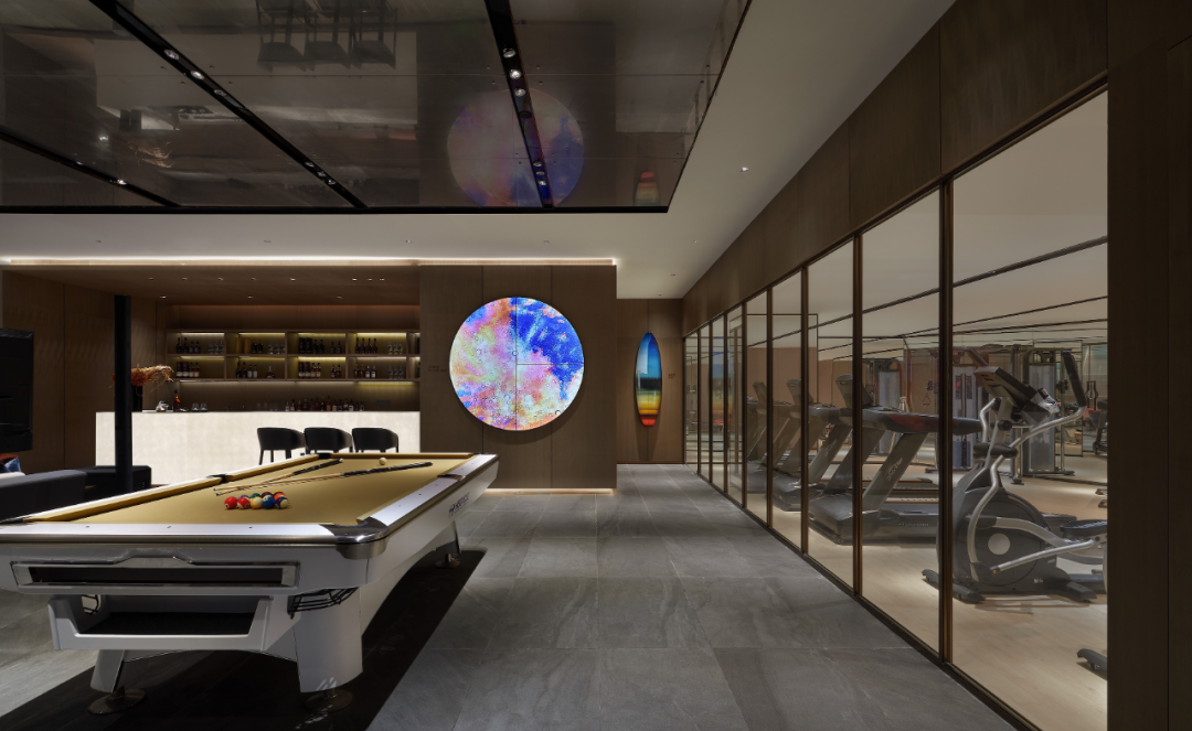水吧区、休息区与桌球室,三个功能空间之间不设明显的边界,设计师希望创造自由的社交情境,既保持三者之间的连结性,同时又各自独立。所以,设计不在形式上做明显的隔离,大多通过设色的层次感予以心理上的体验变化,塑造意境和融的感官表情。