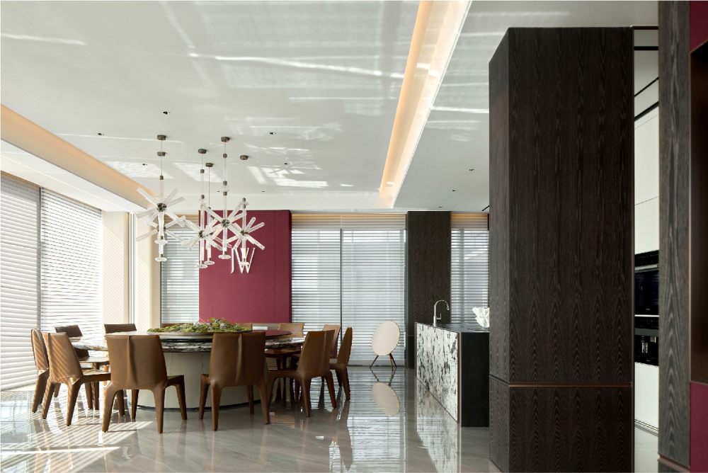 落地窗的绝对魅力在于它的真实性,每时每刻呈现着窗外限定的城市美景与自然景致。地面映射着日暮转换的情态,携自然纹理对话织物的高级简美,将大气隽永、华光沁人的余韵扩展至窗外,绘就新的生活场景。甄选造型感强、柔美端庄的灰调沙发,点缀赭石色单椅,悄然过渡了场域的交界。08用餐区渐起优雅