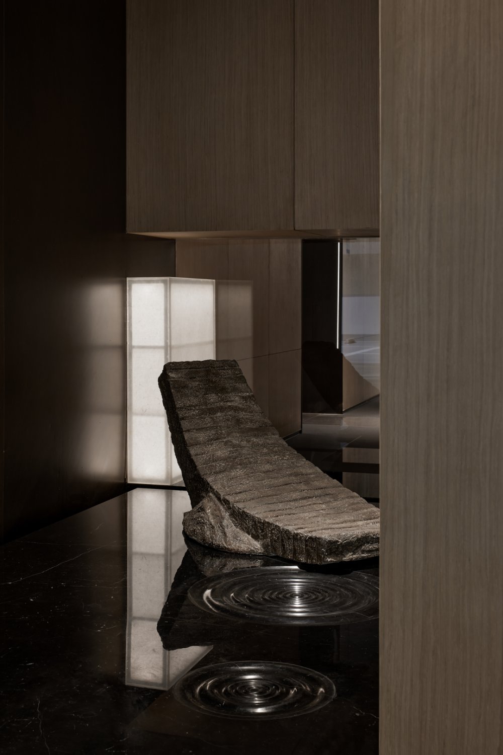 世界喧嚣,摩登更显珍贵。大面积的木饰面、毛石、和纸与枯藤青苔等拙朴的东方美学材质,配合充满现代感的台几、桌案与立柱,渲染出气韵之外的惊喜。光影成为了时间,透过不同颜色的材质晕染空间质感,每一个细微的变化都是新鲜的感受。