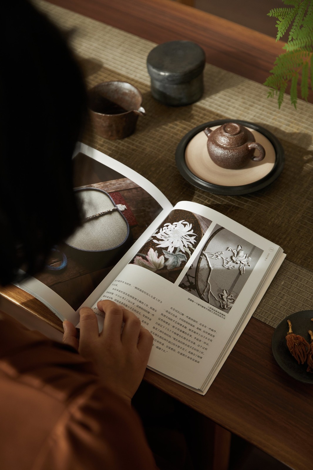 精致的器皿里蕴含着使用者在生活中所追求的仪式感,在入口软装的选型上,融入了一些自然意向,结合矮凳和条桌的选型,放大了空间的禅意氛围,并增加了人们在此处发生交流的可能性。