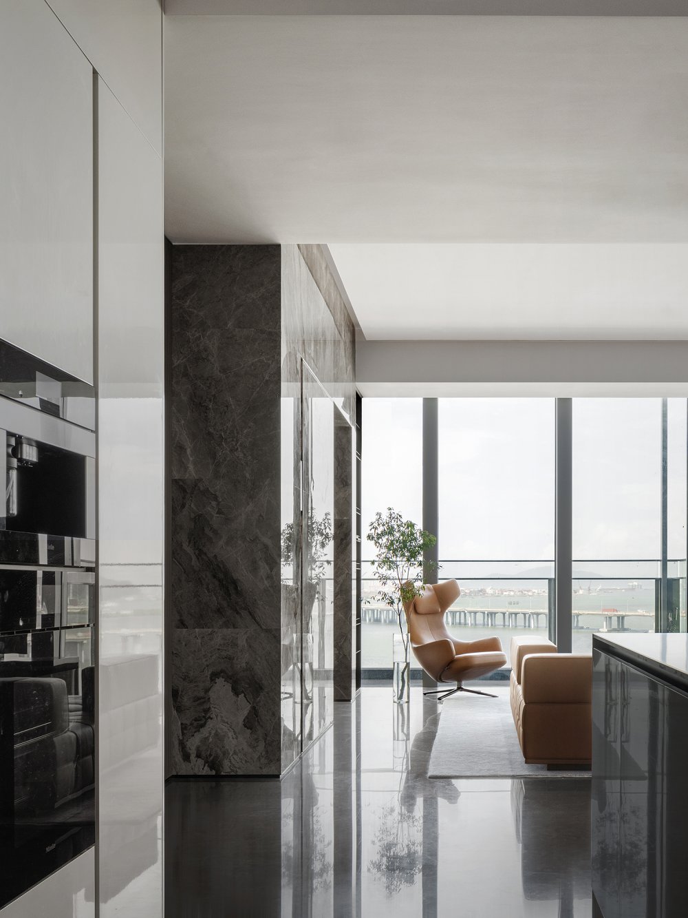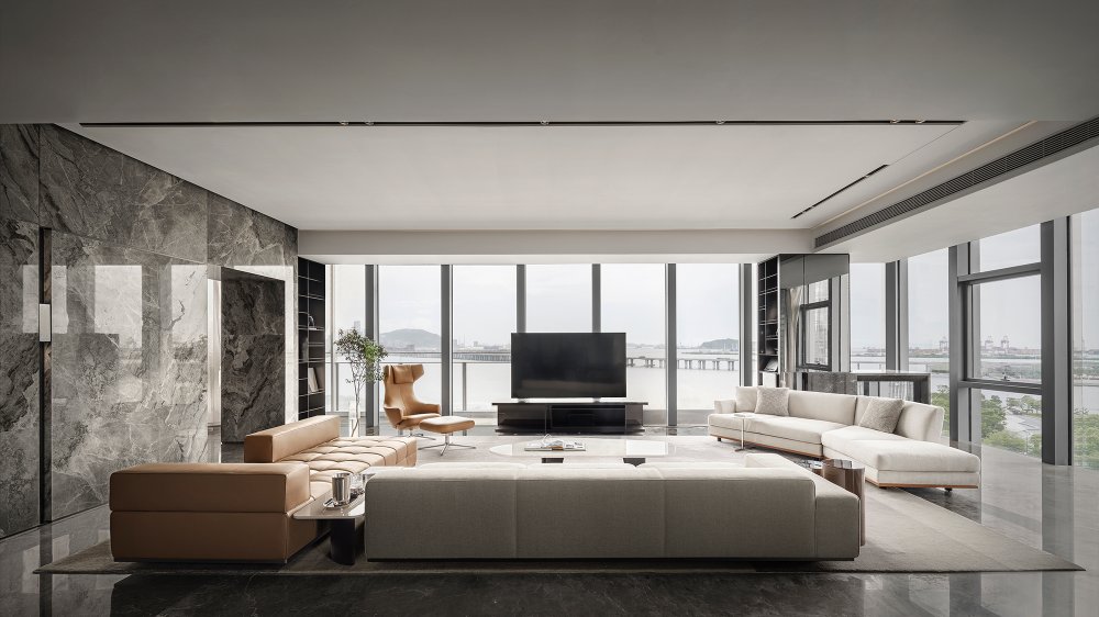 - 有别于窗外景色的丰富饱满,会客厅用不同程度色调的白、棕、灰表达着愈发沉静的内敛。